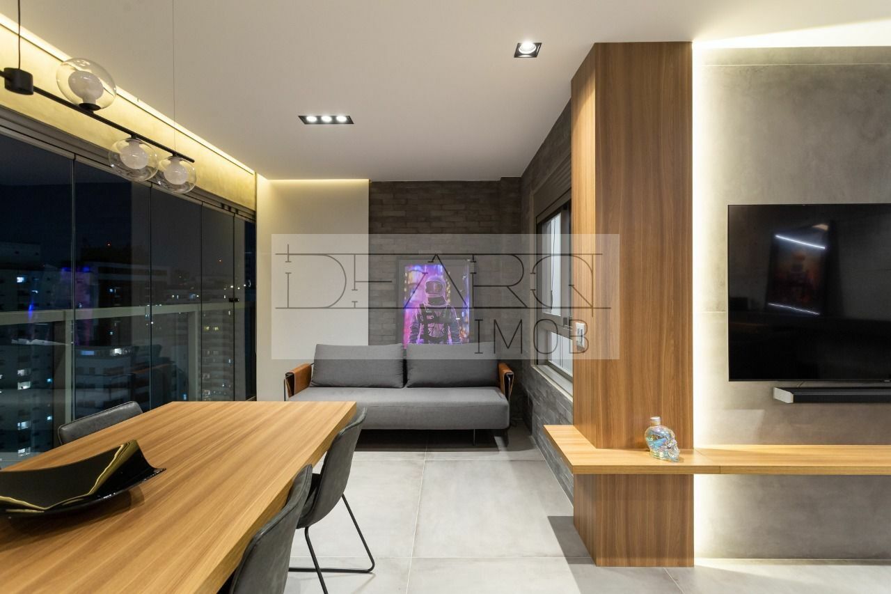 Apartamento moderno e totalmente decorado, com apenas 3 anos, mobiliado e pronto para morar. Possui 2 suítes, sala ampla integrada à varanda gourmet e 2 vagas de garagem. Projeto contemporâneo com excelente padrão de acabamento e decoração atual.